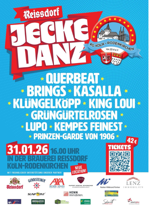 Die KG Köln-Rodenkirchen und die Privat-Brauerei Heinrich Reissdorf führen die erfolgreiche Karnevalsveranstaltung JECKEDANZ in eine neue Zukunft. Nach vielen Höhepunkten in der städtischen Aula des Gymnasiums Rodenkirchen eröffnet die hochmoderne Leerguthalle der Brauerei Reissdorf am 31.01.2026 völlig neue Möglichkeiten für das beliebte Karnevals-Format.