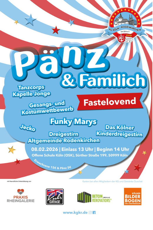 Die legendäre Pänz & Familich Party der KG Köln-Rodenkirchen von 2014 e.V. findet am Sonntag 08. Februar in unserer etablierten Location, der Offenen Schule Köln (OSK) auf der Sürther Straße 199 statt.